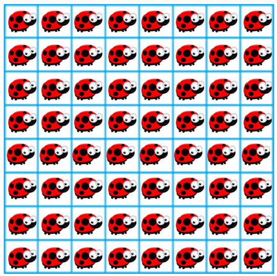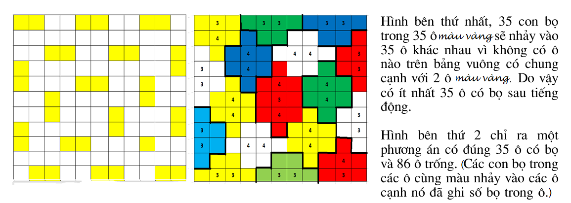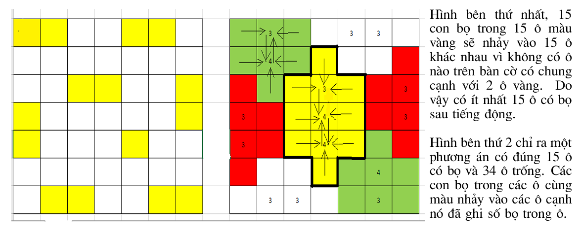 Trên một bảng vuông 8x8 lúc đầu có 64 con bọ, mỗi con đậu trong một ô. Sau một tiếng chuông reo, tất cả con bọ cùng nhảy sang một ô liền kề có cạnh chung với ô mà nó đang đứng.